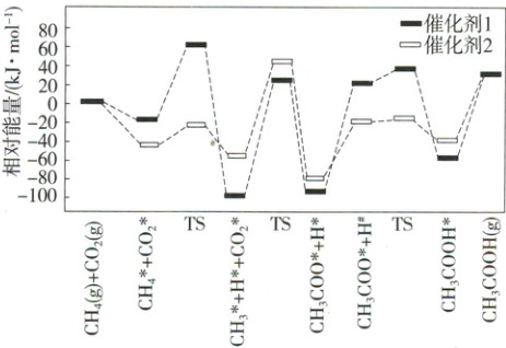 4. (2025·荆州高二质检) $CO_{2}$ 和 $CH_{4}$ 在催化剂表面可以合成 $CH_{3}COOH$,该反应的历程和相对能量的变化情况如下图所示(* 指微粒吸附在催化剂表面,$H^{*}$ 指 H 吸附在催化剂载体上的氧原子上,TS 表示过渡态)。下列说法错误的是