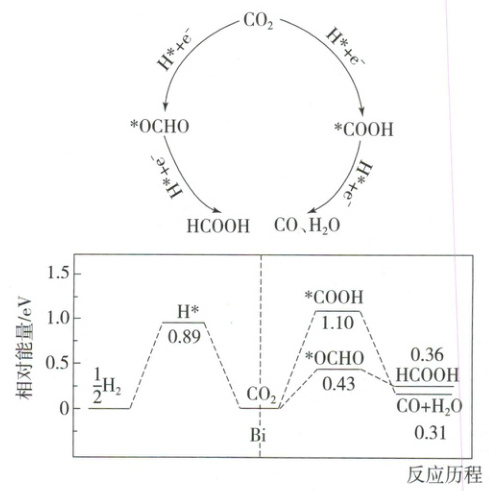 6. (2025·贵阳高二检测) 中国科学院大学以 Bi 为电极材料,以 $CO_{2}$ 为原料利用电化学催化还原法制备 $HCOOH$。用计算机模拟电极材料表面发生反应的历程如下图所示(*表示微粒与 Bi 的接触位点)。下列说法错误的是(
