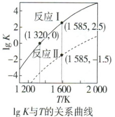已知$K_{p} = p^{n}_{CO}$,$K = (\frac{p_{CO}}{10^{5}\ Pa})^{n}$($n是{CO}$的化学计量数)。反应Ⅰ、Ⅱ的$\lg K$与温度的关系曲线见下图。
