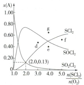 (2)$466K$时,平衡体系内各组分的物质的量分数$x(A)随\frac{n(SCl_2)}{n(O_2)}$的变化如下图所示。