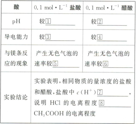 取相同体积、${0.1 mol\cdot L^{-1}}$ 的盐酸和醋酸,比较它们 ${pH}$ 的大小,试验其导电能力,并分别与等量镁条反应。