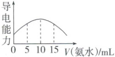 3. 室温下,取 $ 20 \, mL \, c({H^{+}}) = 10^{-3} \, mol \cdot L^{-1} $ 的 $ {HNO_{2}} $ 溶液,加入 $ 0.1 \, mol \cdot L^{-1} $ 的氨水,测得溶液的导电能力随加入氨水体积的变化如下图所示。室温下 $ {HNO_{2}} $ 的电离平衡常数约为(