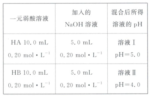 选B。根据酸碱用量可知,溶液Ⅰ为等物质的量浓度的${HA}$和${NaA}$的混合液,溶液Ⅱ为等物质的量浓度的${HB}$和${NaB}$的混合液,且溶液Ⅰ和溶液Ⅱ中${HA}$、${NaA}$、${HB}$、${NaB}$的浓度相等。由电荷守恒可知,溶液Ⅰ中$c({Na^+})+c({H^+})=c({OH^-})+c({A^-})$,$pH=5.0$,故$c({H^+})\gt c({OH^-})$,因此$c({A^-})\gt c({Na^+})\gt c({H^+})\gt c({OH^-})$,A正确;溶液Ⅰ的$pH=5.0$,溶液Ⅱ的$pH=4.0$,故${HB}$的电离常数大于${HA}$的电离常数,即$\frac{K_{a}({HA})}{K_{a}({HB})}\lt1$,B错误;由电荷守恒可知,混合溶液Ⅰ和溶液Ⅱ后有$c({Na^+})+c({H^+})=c({A^-})+c({B^-})+c({OH^-})$,C正确;由于${HB}$的电离常数大于${HA}$的电离常数,故混合溶液Ⅰ和溶液Ⅱ后有$c({HA})\gt c({HB})$,D正确。
