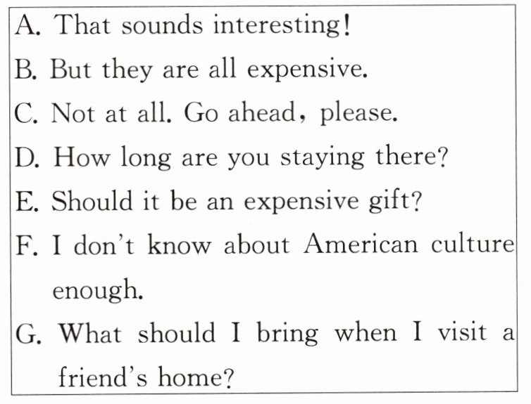 阅读下面对话,从方框内7个选项中选择5个恰当的句子完成此对话。
