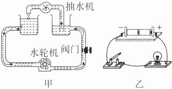 1. 类比是研究物理问题的常用方法。如图甲所示,两容器中的水在抽水机的作用下不断从低处抽运到高处,从而在管道中形成了水流。可以将电路中形成电流的情境(如图乙)与上述情境进行类比。下列类比不合理的是(
