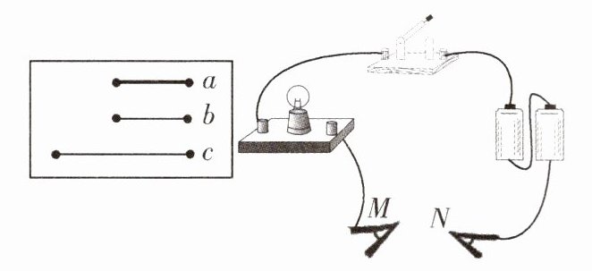 的关系。实验中发现,接电阻丝$c$时灯泡更暗,由此可得出初步结论:在材料和横截面积相同时,长度越长,电阻越大