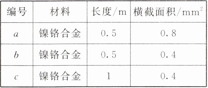 2. 某实验小组在探究“影响导体电阻大小的因素”的实验中,利用如图所示的电路探究“导体电阻跟它的长度、横截面积是否有关”。实验中使用三根电阻丝,规格、材料如表所示。