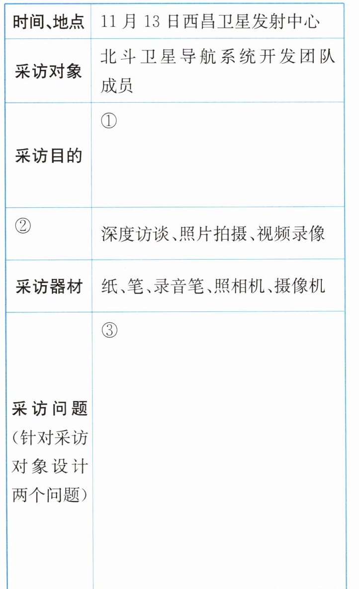 解析:①此次采访的对象是北斗卫星导航系统开发团队成员,采访的目的应和北斗卫星导航系统有关,可以从了解其研发过程、应用范围、性能等方面入手。②由“深度访谈、照片拍摄、视频录像”可知,此处应填“采访方式”。③此处设置的问题要和采访对象的身份、工作及新闻报道的内容有关,可询问北斗卫星导航系统的研发过程、应用场景,研发中遇到的困难等。答案不唯一,符合要求即可。