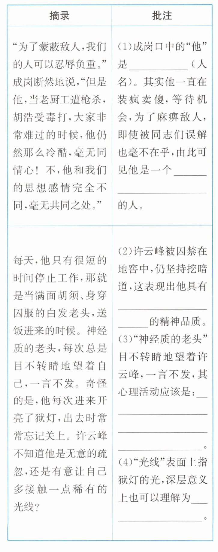 (2)许云峰用手指和半截铁箍偷偷挖暗道,以坚强的毅力挖通地牢的石壁,可见其具有意志坚定的精神品质。