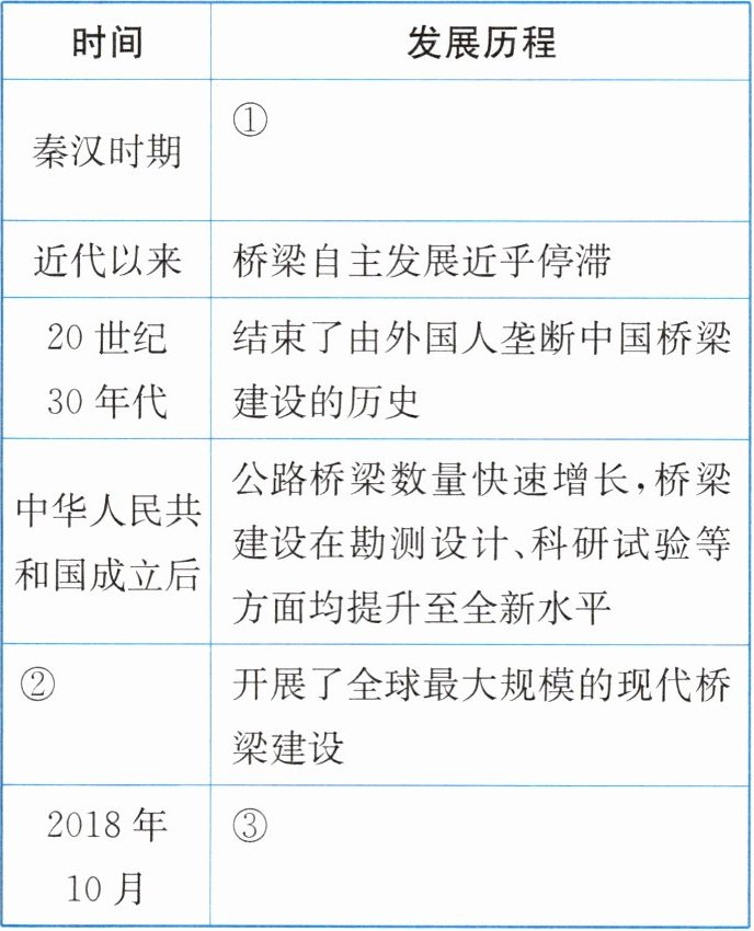 4.材料一介绍了中国桥梁的发展历程,请结合材料内容,将下面的表格填写完整。