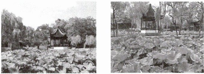 “荷风四面亭”是点景手法的体现。亭子作为“点”,点缀于荷塘环绕的环境中,起到画龙点睛的作用,是人们视线的聚焦点,“荷风四面”的亭名对周围荷塘景色起到点题作用,突出了荷塘四周清风送荷香的景致特点。