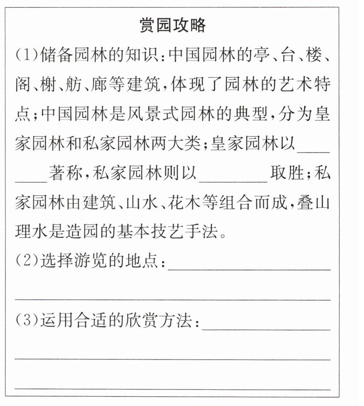 6. 小优一家想去领略中国园林的独特魅力,为此小优制作了一份园林旅游手册。请你根据上述三则材料帮她将其中的“赏园攻略”补充完整。