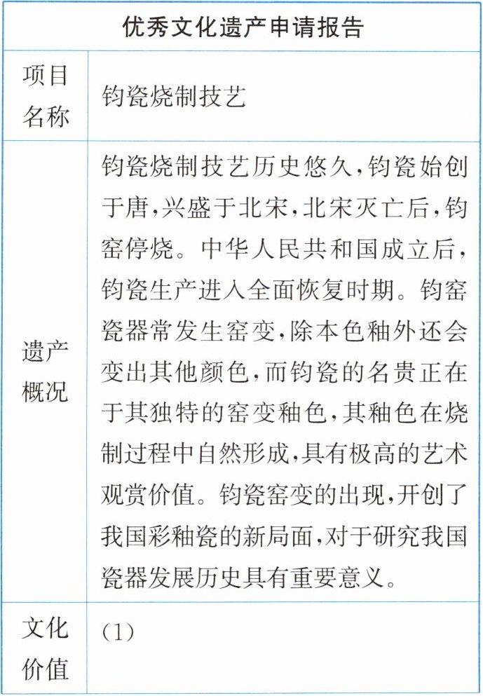2. 参加优秀文化遗产项目评选,需要先递交申请报告。同学们将资料汇总在了“遗产概况”一栏,请你用简洁的语言补全下面的申请报告。