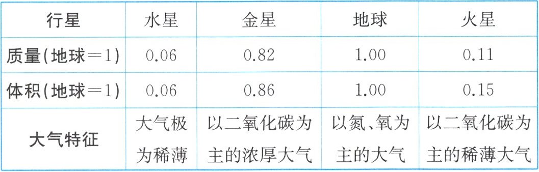|大气特征|大气极为稀薄|以二氧化碳为主的浓厚大气|以氮、氧为主的大气|以二氧化碳为主的稀薄大气|