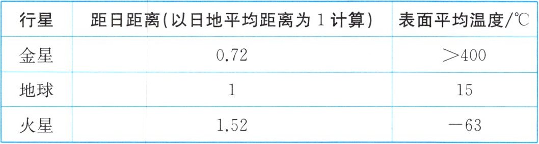 (1)距日距离越近,行星表面的平均温度越高;距离越远,平均温度越低(合理即可)