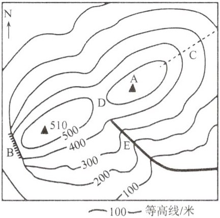 1.B 2.C 解析:第1题,据图可知,该等高线地形图的等高距为100米,所以山峰A的海拔在500—600米。第2题,据图可知,B处等高线出现重叠,为陡崖;C处等高线的弯曲部分凸向低处,为山脊;D处为鞍部;E处等高线的弯曲部分凸向高处,为山谷。