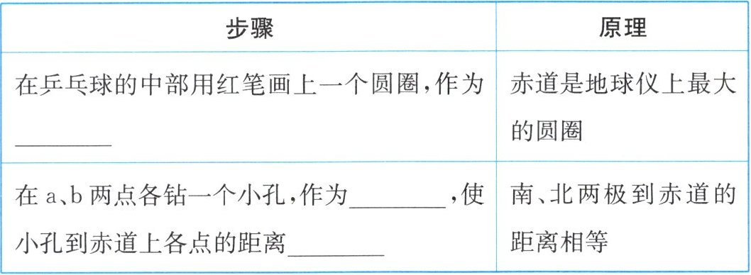 |在a、b两点各钻一个小孔,作为____,使小孔到赤道上各点的距离____|南、北两极到赤道的距离相等|
