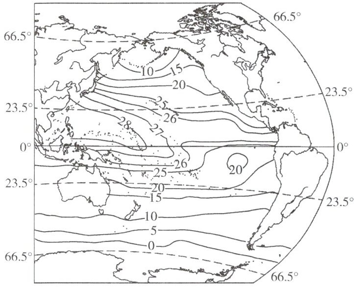 读某月太平洋表层海水等温线(单位:$^{\circ}C$)分布图,回答3~4题。