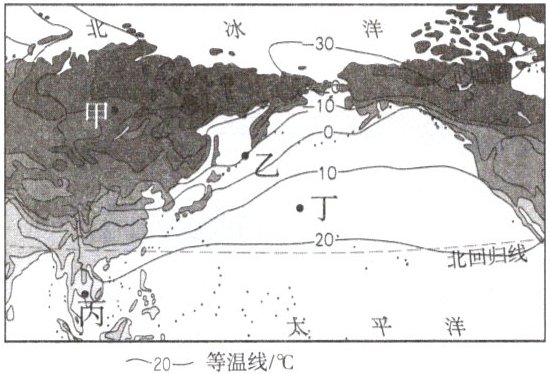 5. 甲、乙、丙、丁四地中,1月气温最高的是( )