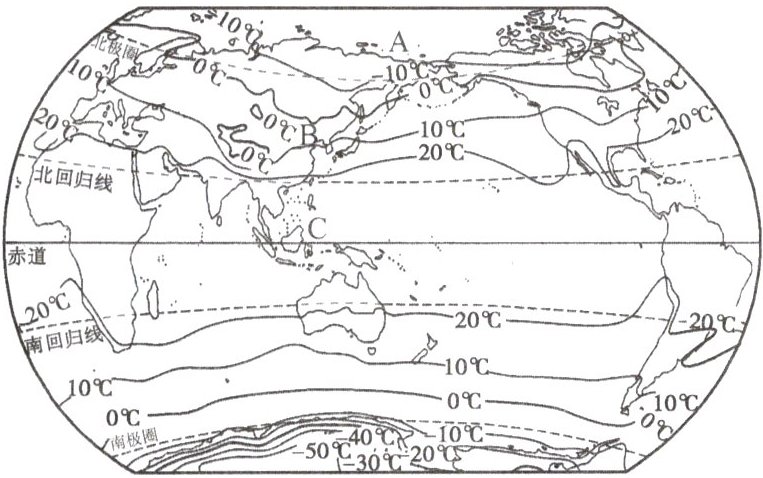 (4)图中南半球$20^{\circ}C$等温线与______(纬线)较为接近,穿过______洲、______洲和______洲。