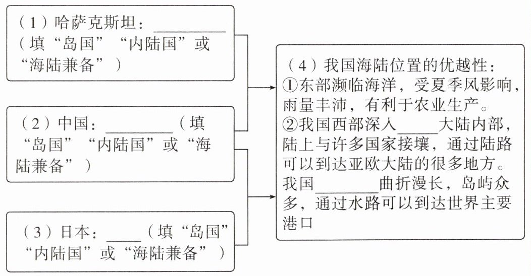 2. 比较中国与哈萨克斯坦、日本海陆位置的差异,归纳中国海陆位置的优越性。