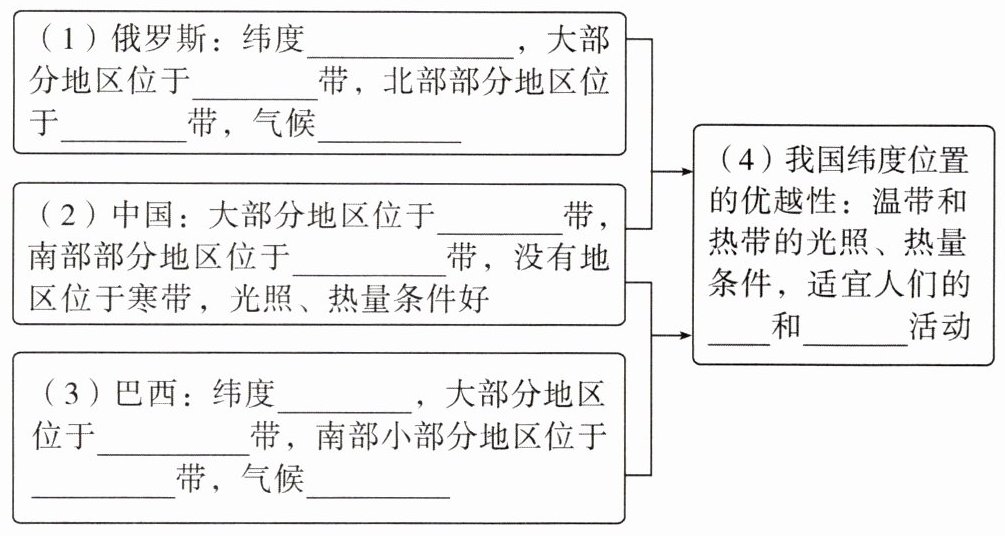 1. 比较中国与俄罗斯、巴西纬度位置的差异,归纳中国纬度位置的优越性。