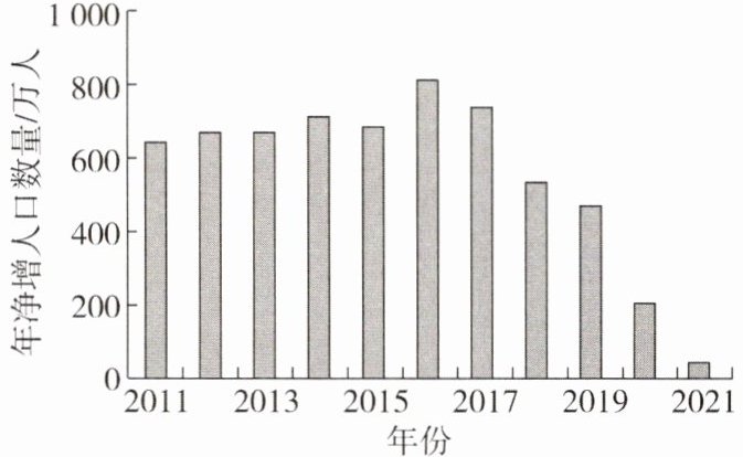5.C 6.A 解析:第5题,读图可知,我国年净增人口数在2021年最少;2011年至2016年年净增人口数呈现波动增加状态,2017年至2021年呈现减少趋势。第6题,2011—2021年,我国年净增人口数均为正值,说明人口总量在逐年增长;但在2017年至2021年,我国年净增人口数呈现减少趋势,说明近年来我国人口总数增长变缓。