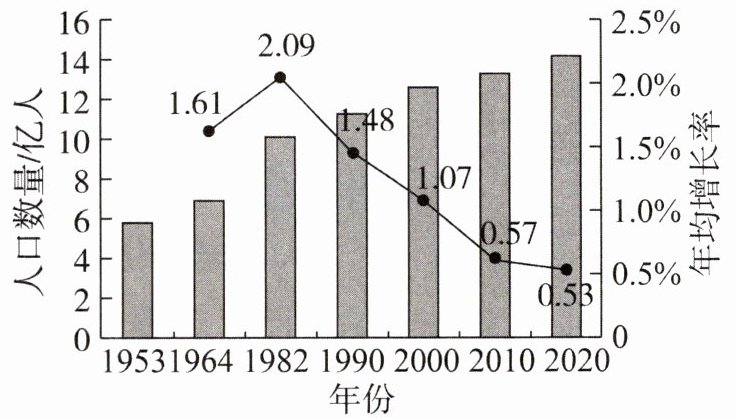 读我国七次全国人口普查的人口数(不包括香港、澳门特别行政区和台湾省人口数)和年均增长率统计图,回答 1~2 题。