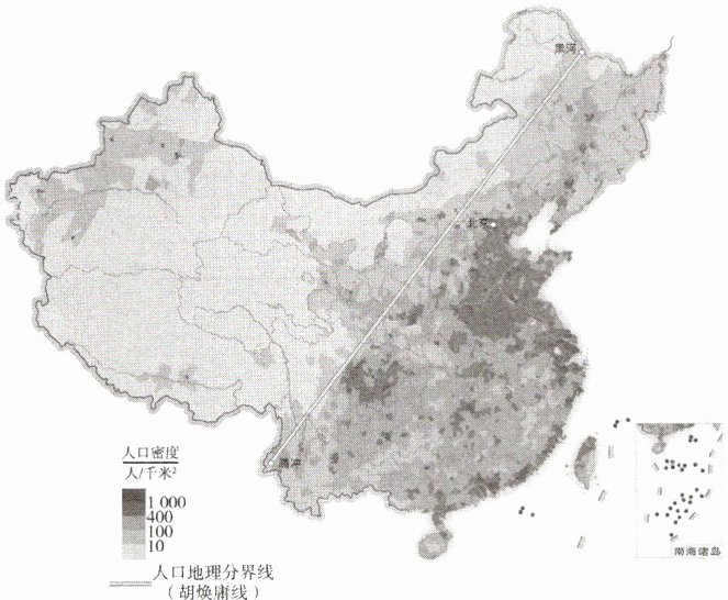 黑河—腾冲一线是我国人口地理分界线。下图为中国人口的分布图。读图,回答 3~4 题。