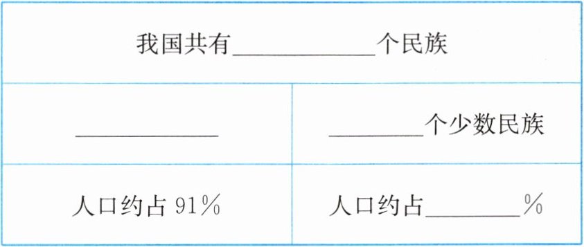 1.56 汉族 55 9 2.壮 回族 土家族 1 3.我国各民族不论人口多少,一律平等 4.中华民族共同体 语言 文字 饮食