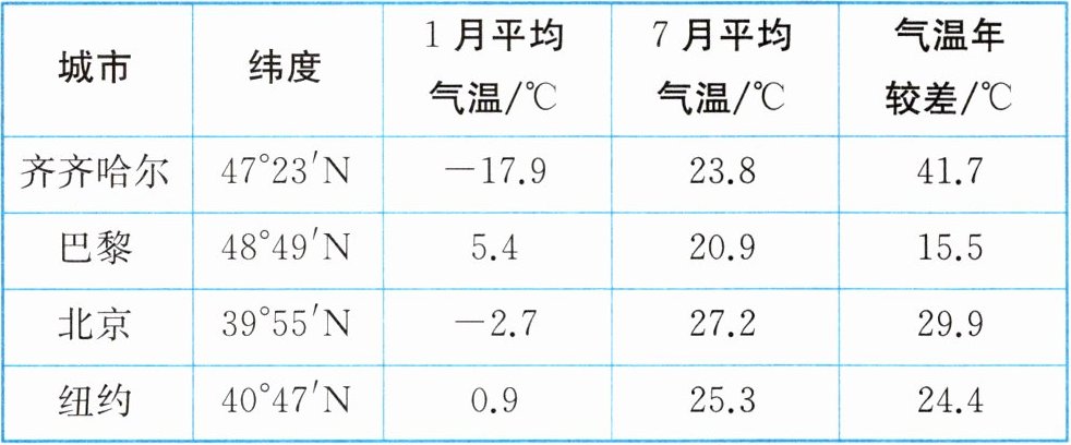 1. 1月,齐齐哈尔的平均气温比巴黎低