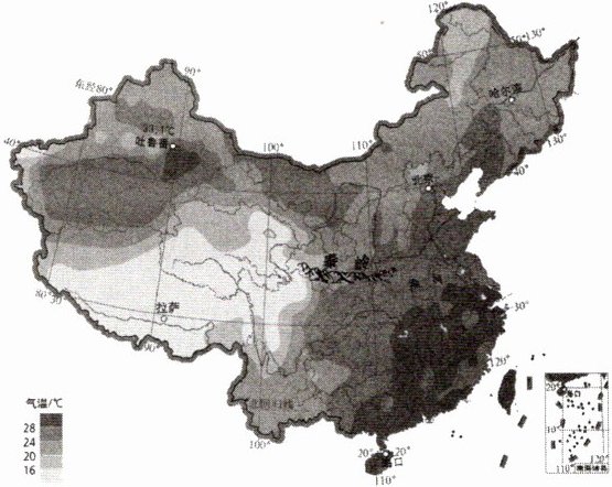 )①南北气温差别大 ②东西气温差别大 ③纬度高的黑龙江漠河气温最低 ④地势高的青藏高原气温最低