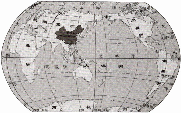 歌曲《我们伟大的祖国》这样描述我们伟大祖国的疆域辽阔:“当北国的钢花映红了飞雪,江南的田野正是春色妖娆。当东海的哨兵迎来了灿烂的朝霞,戈壁油田的灯光还在闪耀……”读中国在世界的位置图,回答 1~2 题。