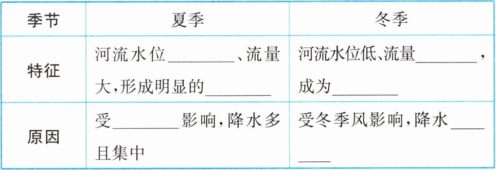 季节:夏季 河流水位高、流量大,形成明显的汛期;冬季 河流水位低、流量小,成为枯水期;原因:受夏季风影响,降水多且集中;受冬季风影响,降水少