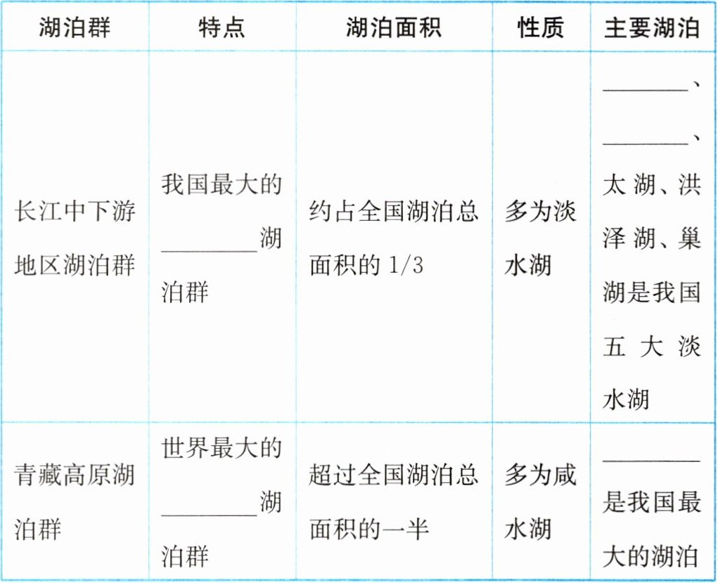 1.众多 广泛 集中 2.长江中下游地区湖泊群:我国最大的淡水湖泊群,主要湖泊鄱阳湖、洞庭湖;青藏高原湖泊群:世界最大的高原湖泊群,主要湖泊青海湖