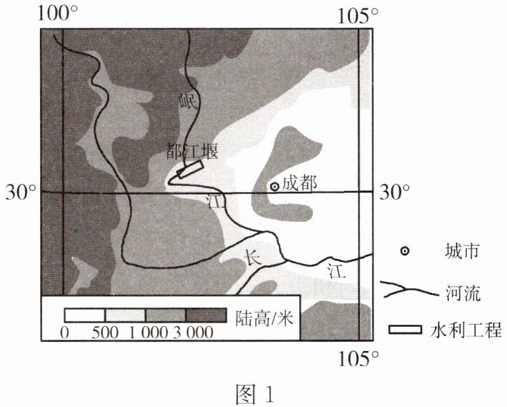 图1:显示成都周边区域,标注了岷江、都江堰、成都、长江等,有陆高(米)的图例。