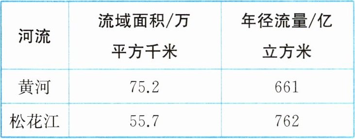 松花江主要流经东北平原的湿润和半湿润区,是黑龙江在我国境内的最大支流。读松花江某水文站流量年变化曲线图及黄河和松花江流域面积、年径流量对比表,回答9~10题。