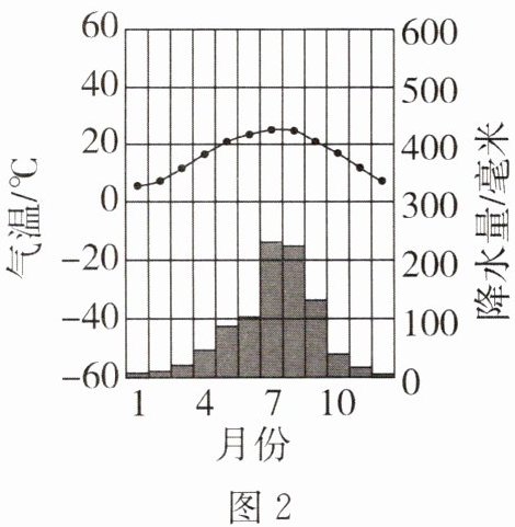 图2:横坐标为月份(1、4、7、10),纵坐标左侧为气温(℃),右侧为降水量(毫米)。气温曲线显示1-12月气温变化,降水量柱状图显示各月降水量。