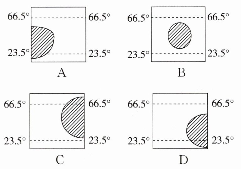 9. 下面四幅图中,正方形代表亚欧大陆,图中阴影能正确反映我国位置的是(
