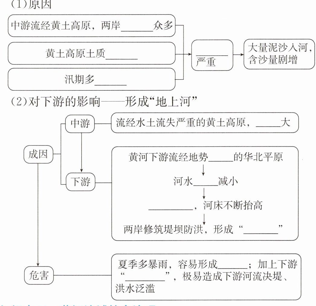 (2)含沙量 平缓 流速 泥沙淤积 地上河 洪水 地上河
