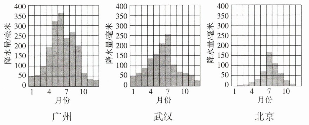 1. 读中国东部三个城市多年平均各月降水量图,探究我国水资源的季节变化特点。