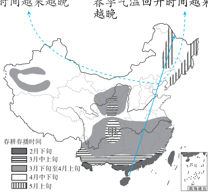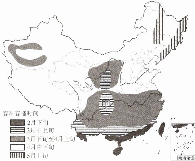 14.B 15.B 解析:第14题,解答本题的关键是从图中获取信息。从图中可以看出东部地区春耕春播时间越向北越晚。如图所示: ②从南向北,春耕春播时间越来越晚①从南向北,纬度升高,春季气温回升时间越来越晚