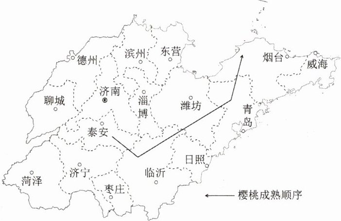 大樱桃适合生长在通风条件良好、光照充足的丘陵地带。山东的露天大樱桃每年从泰安开始成熟,然后是临沂、潍坊、青岛等地,烟台成熟最晚。近几年山东积极推进樱桃小镇建设,实现规模化经营。多家快递企业将服务直接延伸至樱桃种植园,实现第一时间封装,并通过快递网络将新鲜优质大樱桃发往北京、上海等地。下图示意山东露天大樱桃成熟先后顺序。据此回答 16~17 题。