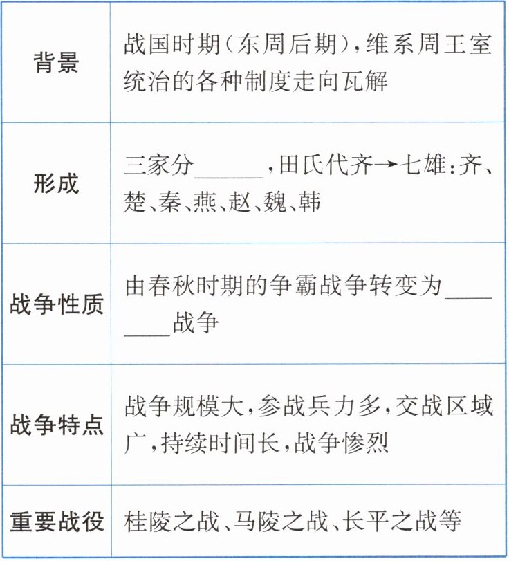 (3)赵国:赵武灵王学习北方游牧民族,组建骑兵部队。自胡服骑射以后,赵国军事实力增强,成为战国后期六国中能与当时最强大的秦国抗衡的诸侯国。