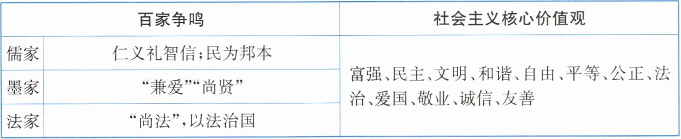 C 解析:表中反映出百家争鸣时的主张与社会主义核心价值观有相似之处,百家争鸣是中国古代第一次思想文化发展的高峰,促进了思想和学术的繁荣,奠定了后世传统思想文化的基础,对后世的思想文化影响深远。