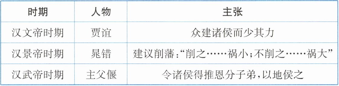 B 解析:根据所学知识可知,贾谊的主张“众建诸侯而少其力”实则是削弱诸侯国实力。由“建议削藩:‘削之……祸小;不削之……祸大’”等信息可知,反映的是晁错主张削藩,加强中央集权。为了加强中央集权,汉武帝采纳主父偃主张“令诸侯得推恩分子弟,以地侯之”,下诏诸侯王可将封地分封给其子弟作为侯国,由皇帝制定封号,划归临近的郡管辖。这样,侯国越来越多,诸侯王的封地和势力越来越小,进而达到削弱诸侯国的势力,强化中央集权的目的。因此贾谊、晁错、主父偃三者的共同主张是强化中央集权,B项正确。