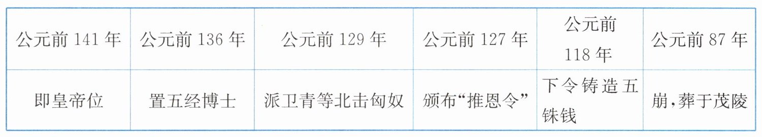 D 解析:根据表格内容“置五经博士”“派卫青等北击匈奴”“颁布‘推恩令’”“下令铸造五铢钱”并结合所学知识可知,为了加强中央集权,解决王国问题,汉武帝接受主父偃的建议,颁布“推恩令”;为了加强思想统治,汉武帝接受董仲舒的建议,尊崇儒术,把儒家学说立为正统思想,在长安兴办太学,置五经博士;为加强朝廷对社会经济的控制,汉武帝把铸币权收归中央,统一铸造五铢钱;汉武帝派卫青、霍去病等北击匈奴,故题干表格反映的内容与汉武帝有关。汉武帝从政治、经济、思想、军事等方面巩固了大一统的局面,使西汉王朝开始进入鼎盛时期,D项正确;从公元前141年到公元前87年,汉武帝一共在位54年,不是在位35年,排除A项;题干人物是汉武帝,与秦始皇和汉高祖无关,排除B、C两项。