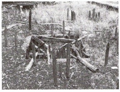 材料 考古工作者在河姆渡遗址发现了木结构浅水井遗迹。这是中国目前所知最早的木结构水井遗迹之一,也是迄今发现的采用竖井支护结构的古老遗存。水井位于一处浅圆坑内,井口方形,边长约 2 米,井深约 1.35 米。井内紧靠四壁栽立着几十根排桩,内侧用一个榫卯套接而成的水平方框支顶,以防倾倒。排桩上端平放长圆木,构成井口的框架。水井外围是一圈直径约 6 米呈圆形分布的 28 根栅栏桩,另在井内发现有平面略呈辐射状的小长圆木和苇席残片等,可见井上还盖有井亭。