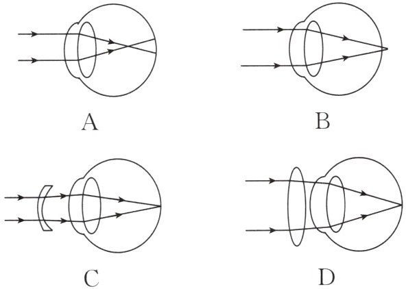 (2)近视人群眼球的前后径过长或角膜、晶状体的曲度过大,导致远处物体反射来的光经折射所形成的物像落在视网膜的前方,如A图所示;近视后,需要戴近视镜,即凹透镜进行矫正,使物像落在视网膜上,如C图所示,从而看清远处的物体。