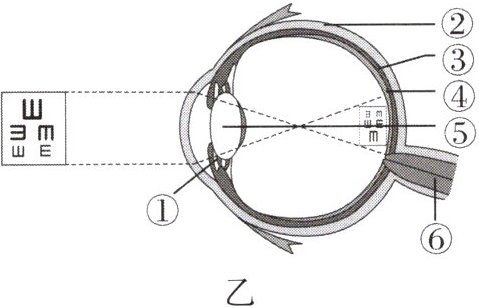 (1) 看视力表时,字母“E”在图乙中的[ ]______上成像,该结构含有大量对光敏感的细胞,可将亮度、色彩等信息沿着结构[ ]______传给大脑的特定区域,形成视觉。